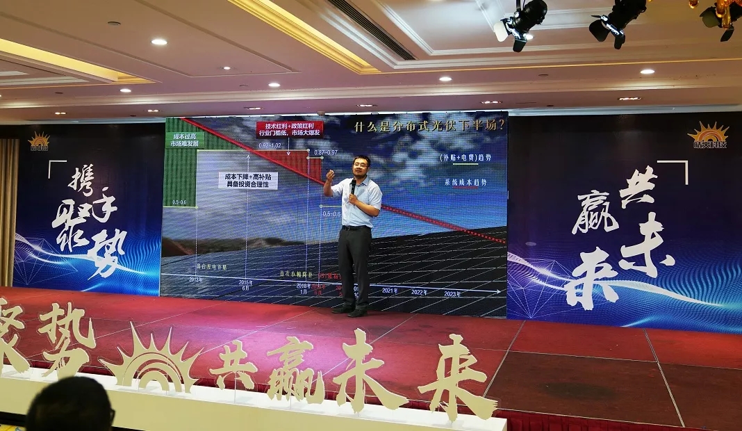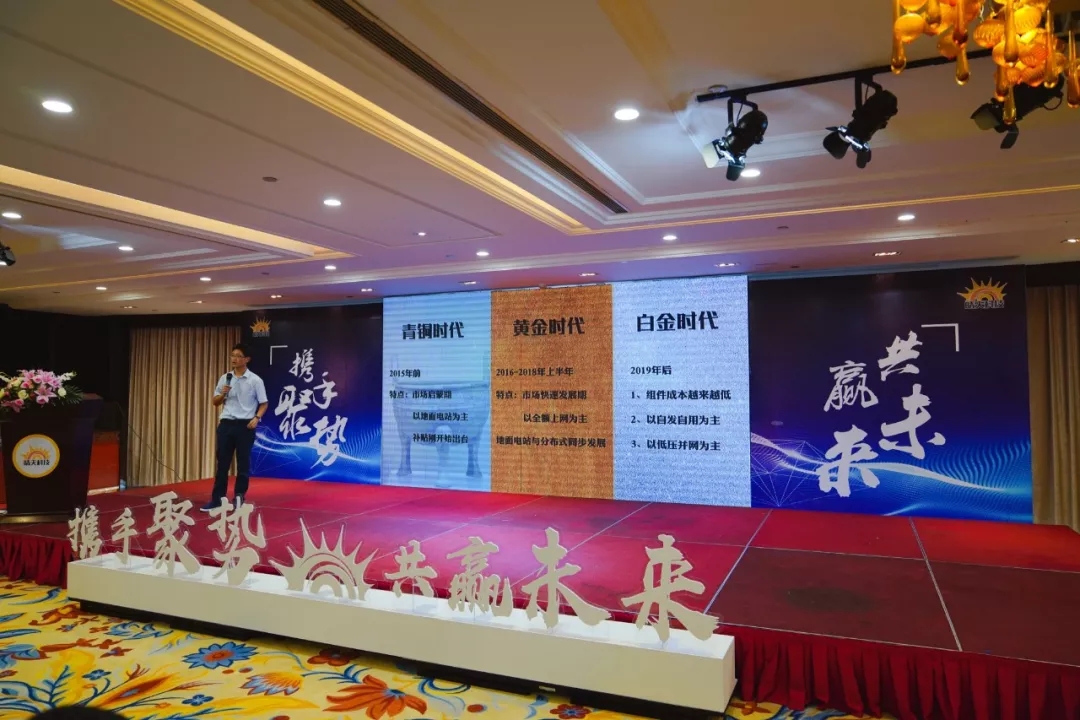 基于【攜手聚勢 共贏未來】,晴天科技總裁助理吳國榮先生發(fā)布了工商業(yè)戰(zhàn)略合作模式。吳總為我們總結了光伏發(fā)展的三個階段:青銅時代、黃金時代、白金時代,如今我們正身處光伏發(fā)展的白金時代。自發(fā)自用的工商業(yè)模式,直擊企業(yè)用電成本高昂的痛點,已然成為分布式光伏發(fā)展的主力軍。而因工商業(yè)項目各環(huán)節(jié)的復雜性,使得越來越多的行業(yè)同行者達成攜手共贏的共識,晴天科技將真誠提供合作平臺,期待未來共享光伏新時代。