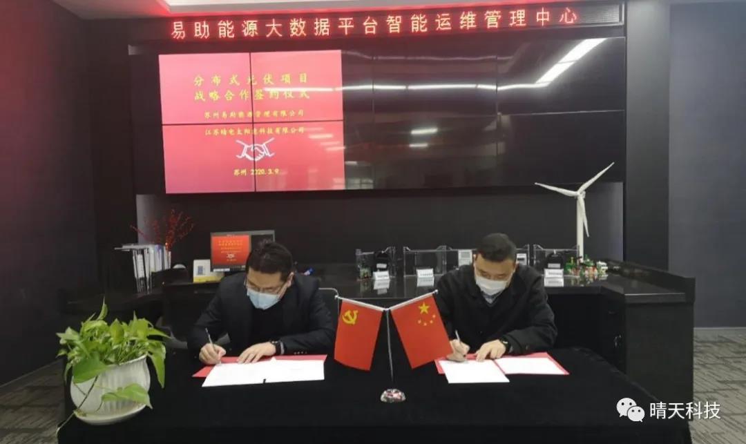 2020年3月9日上午,江蘇晴電太陽能科技有限公司與蘇州易助能源管理有限公司正式簽署了《分布式光伏項目戰略合作協議》。江蘇晴電太陽能科技有限公司總裁張總、蘇州易助能源管理有限公司董事長袁總代表雙方公司簽約。簡單的簽約儀式上張總和袁總共同表示,雙方將在新能源項目開發、工程承包、智能運營管理和光伏電站檢測等多領域開展深度戰略合作,共同發展,互利共贏。