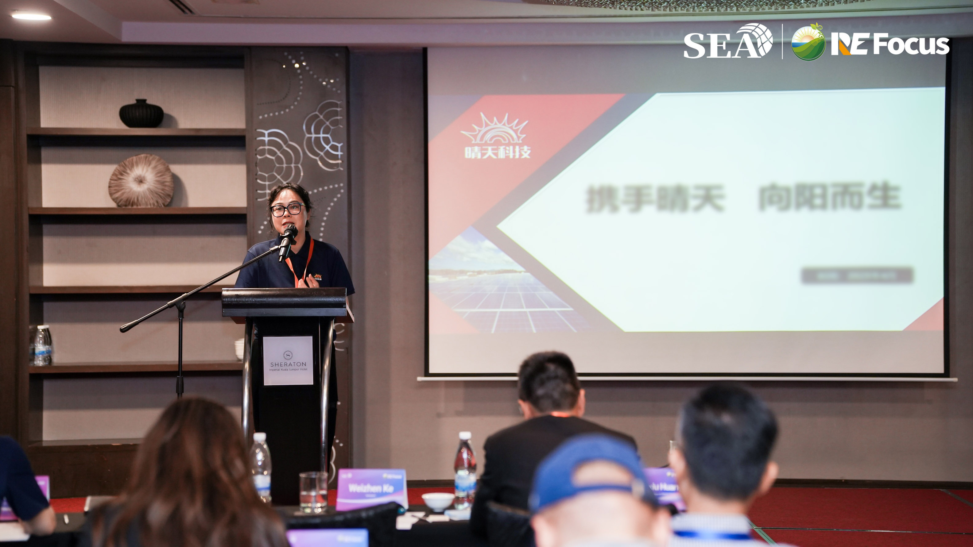 本次論壇以“赤道聚能·光啟新章”為主題,圍繞東南亞光儲(chǔ)市場(chǎng)的本土化挑戰(zhàn)、政策驅(qū)動(dòng)與場(chǎng)景創(chuàng)新展開深度交流。晴天科技副總裁柯偉貞女士就“攜手晴天,向陽而生”發(fā)表了主題演講。