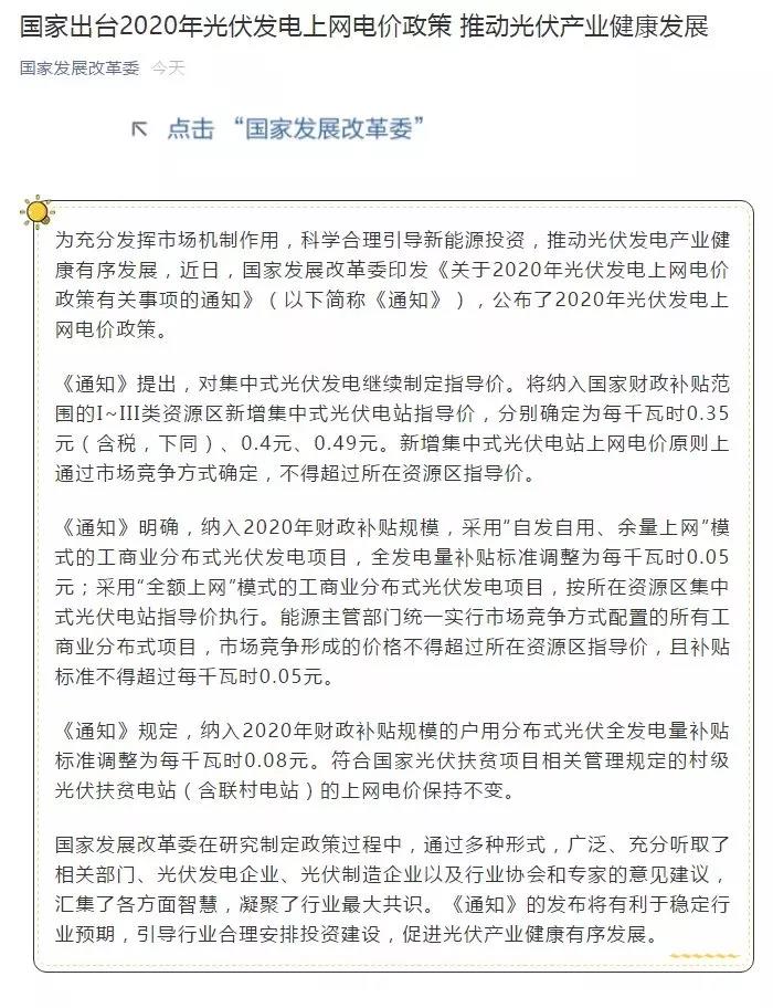 2020年4月2日,國家發(fā)改委在官方微信上,《關(guān)于2020年光伏發(fā)電上網(wǎng)電價政策有關(guān)事項的通知》(以下簡稱《通知》),公布了2020年光伏發(fā)電上網(wǎng)電價政策。